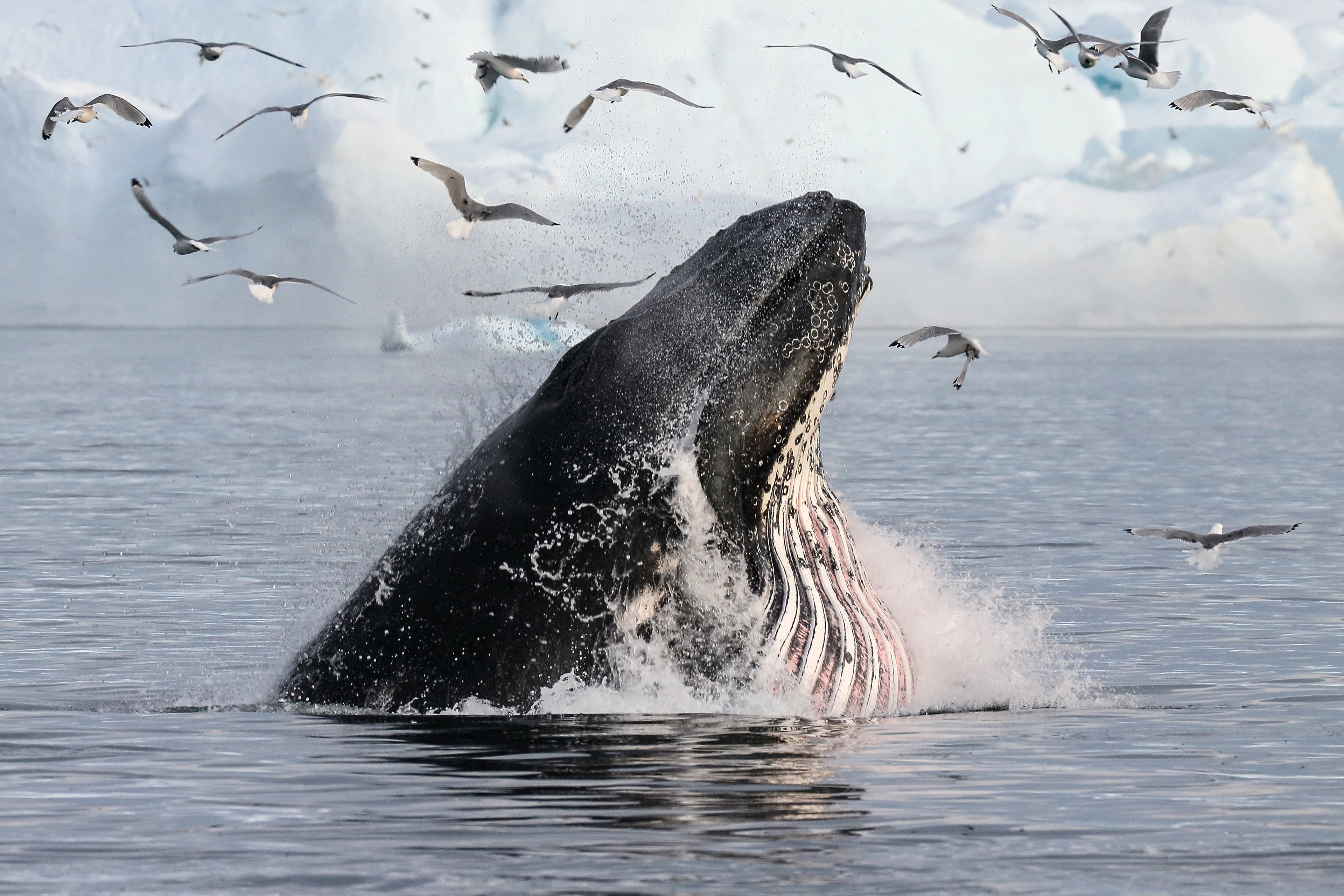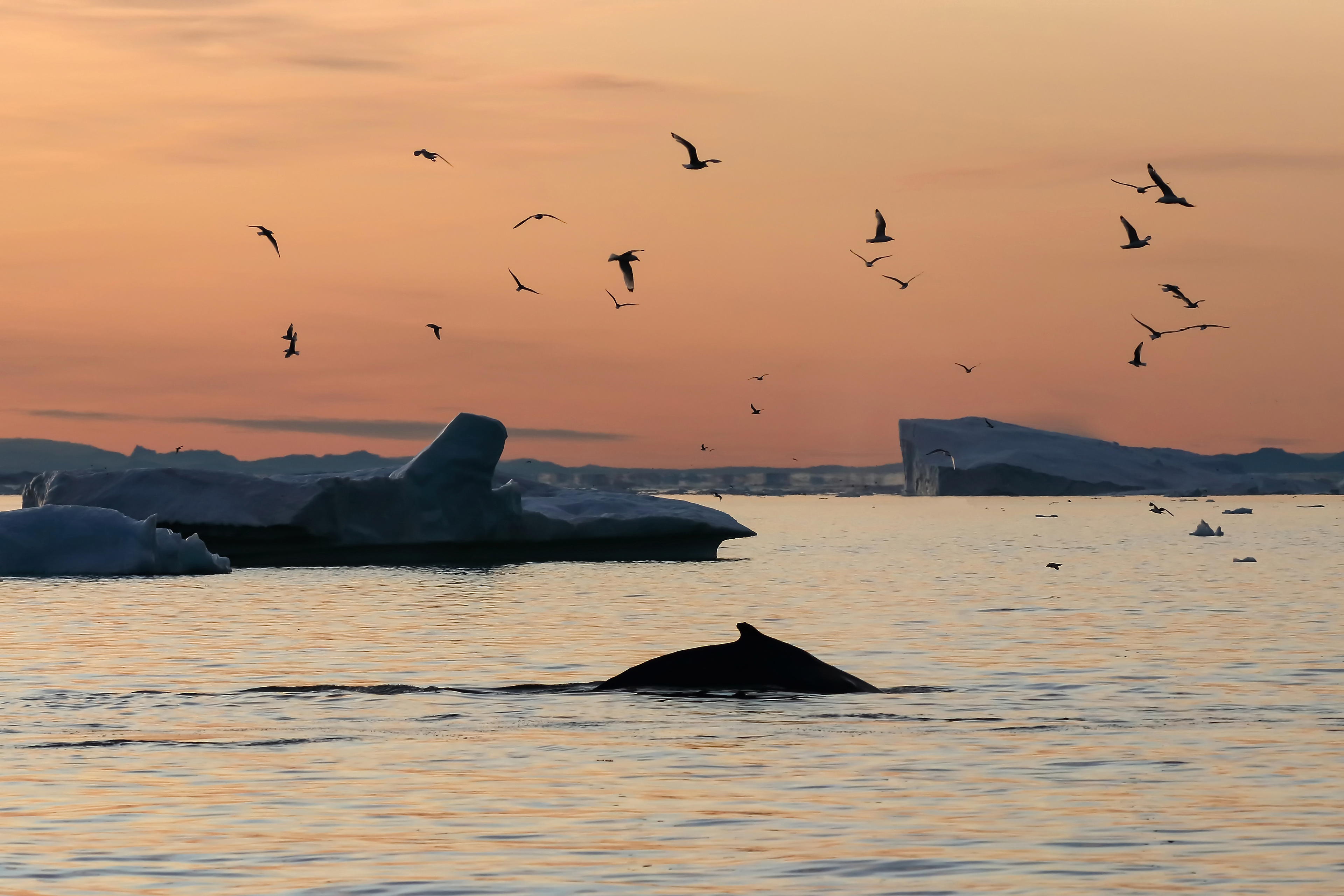 Humpback whales photographed in Disko Bay off the west coast of Greenland. The Kangia Glacier (the largest in the northern hemisphere) reaches the sea here pushing huge icebergs out into the bay near the town of Ilulissat. This Ilulissat Ijsfjord is a UNESCO world heritage site.